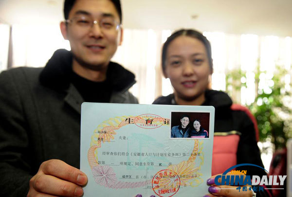 2014年2月14日,何少东(左)和妻子周俊在展示领取的“单独二孩”生育证。当日,家住安徽省合肥市经开区36岁的何少东和33岁的妻子周俊拿到了“二孩准生证”。(新华社记者 刘军喜 摄)