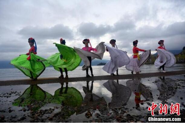 一群女子穿着摩梭服饰在泸沽湖畔留下倩影。