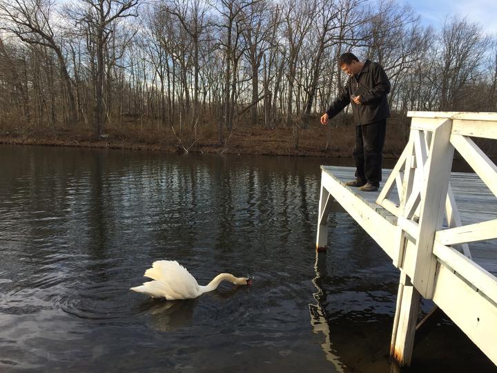 这湖叫希思湖,像纽英格伦千万个湖一样,躺在长岛海滨的丛林里,朴素得像一个穿着粗布的村姑。只有在阳光下,湖水沉静地涌动着,你才能感觉到她潜在的气质,高贵如同皇族。我几乎天天面对她,只要从电脑上抬望眼,就可以透过面前的七扇窗户,望见长长的希思湖,就像望见一整幅山水宽影幕一样。湖水是清淡的褐色,只有太阳出来了,湖水才显出华丽的淡蓝;如果是逢春入秋,丛林透绿,湖水便浸染成一湾碧玉。打开后门,走到木台上看湖,湖水清澈见底,大小鱼儿趴在水底,一动不动,或许是懒得动,或许在伺机等待可以入口的生物。水草在湖底飘逸,像在呢喃着万般柔情。这里已经跨过新年了,却遇到百年不见的暖冬,至今都不见下一场轰轰烈烈的白雪。但树叶照旧飘零,时常可以听到枯枝断裂声。唯有塔松还流露着枯绿,守着自己的坚贞。几只松鼠在粗大的树干上爬上爬下,那副欢快的模样,就像在拨动着塔松的心弦。但真正让希思湖生动起来,是湖上那些生灵。大约有几百只野鸭,常驻在希思湖上,鸭群在湖中游来游往,或者在湖面上飞来飞去,或者在岸边寻食嬉戏,大都成群结队,极少分散活动。一旦遇到惊扰,几百只野鸭贴着湖面,扑愣愣奋力拍打翅膀,腾飞而去。这时候,只有两只白天鹅依然从容地留在湖面,实际上这两只白天鹅才是希思湖的主人。