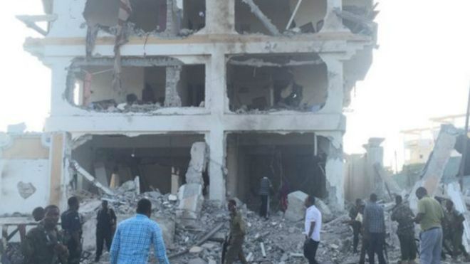 BBC记者Moalimu在爆炸发生时距离现场不到150米,他说,酒店的一侧被完全炸毁,这是他在摩加迪沙看到过的破坏最为严重的一起攻击事件。