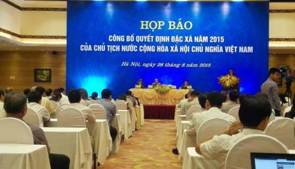 2015年8月28日上午,越南国家主席办公厅配合越南公安部、最高人民法院、外交部、政府办公厅以及各相关部门,在越南河内国际会议中心召开越南国家主席2015年特赦决定公布新闻发布会。(摄影: 中国日报驻河内记者 王健)