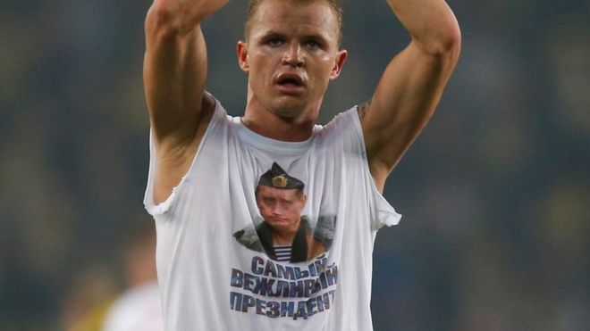 中国日报网2月17日电(高琳琳) 据英国广播公司16日报道,2015/16赛季欧联杯1/16决赛首回合,土超领头羊费内巴切坐镇主场迎战俄超劲旅莫斯科火车头。全场比赛结束时,火车头队中场球员德米特里·塔拉索夫脱下球衣,露出T恤衫,上面印着俄罗斯总统普京头戴海军帽的照片,下方写着“最文雅的总统”。