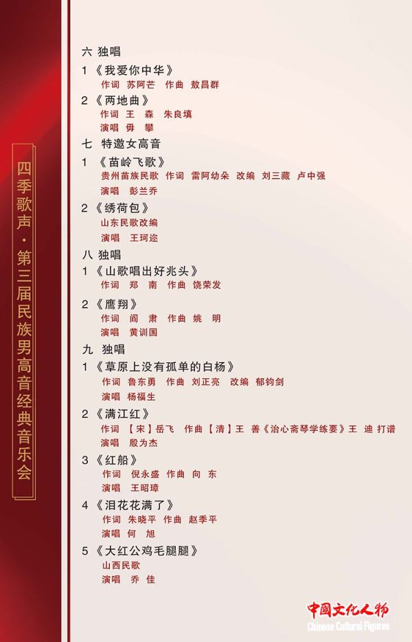 中国文化人物(记者 苏晴)由中国-东盟艺术学院主办,金伯利集团协办,中国民族男高音声乐艺术研究会等单位承办,殷秀梅任艺术总顾问,吕继宏任艺术总监,张也、李丹阳、方琼、王宏伟、丁毅、戴滨、廖勇任艺术顾问,刘和刚任总导演,郁钧剑任总策划的“四季歌声