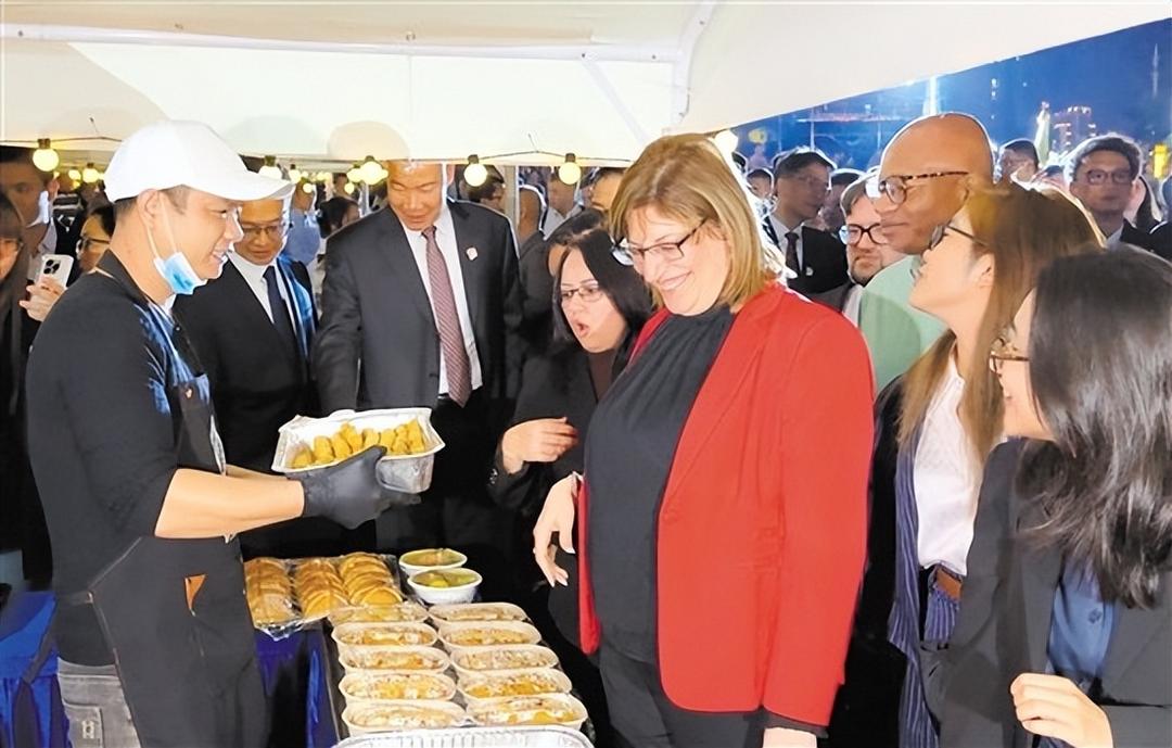 中拉文化摊位上,嘉宾们品尝拉美特色小食。